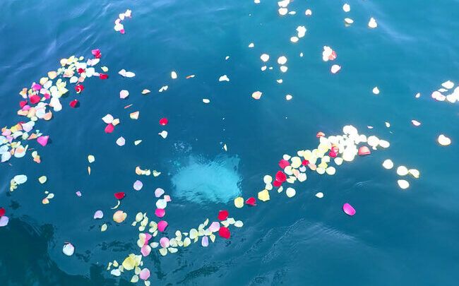 散骨後には、お花やお酒、水を海へ捧げ、黙祷を捧げます。ご遺族の想いとともに、静かな祈りの時間をお過ごしください。心を込めた最後のお別れを大切にいたします。